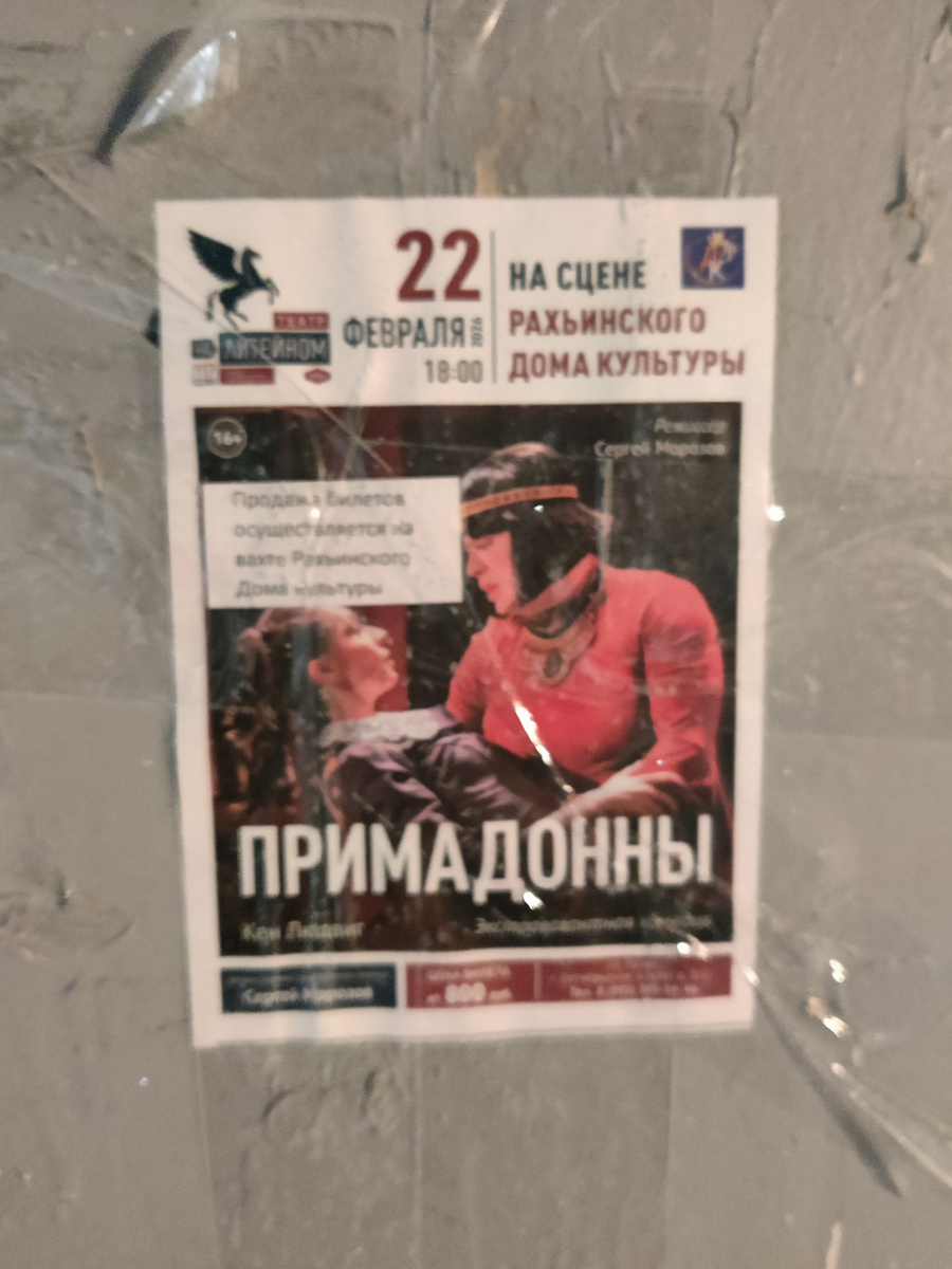 Здравствуй, дорогой читатель! Театр на Литейном не раз меня радовал своими постановками. Каждое его посещение остаётся тёплым и уютным воспоминанием в моём сердце. А тут такая радость: любимый театр приезжает в мой посёлок Рахья со спектаклем "Примадонны" , на который я хотел сходить. Узнал я об этом благодаря вот такой маленькой афише на ж/д станции, когда уезжал в город.