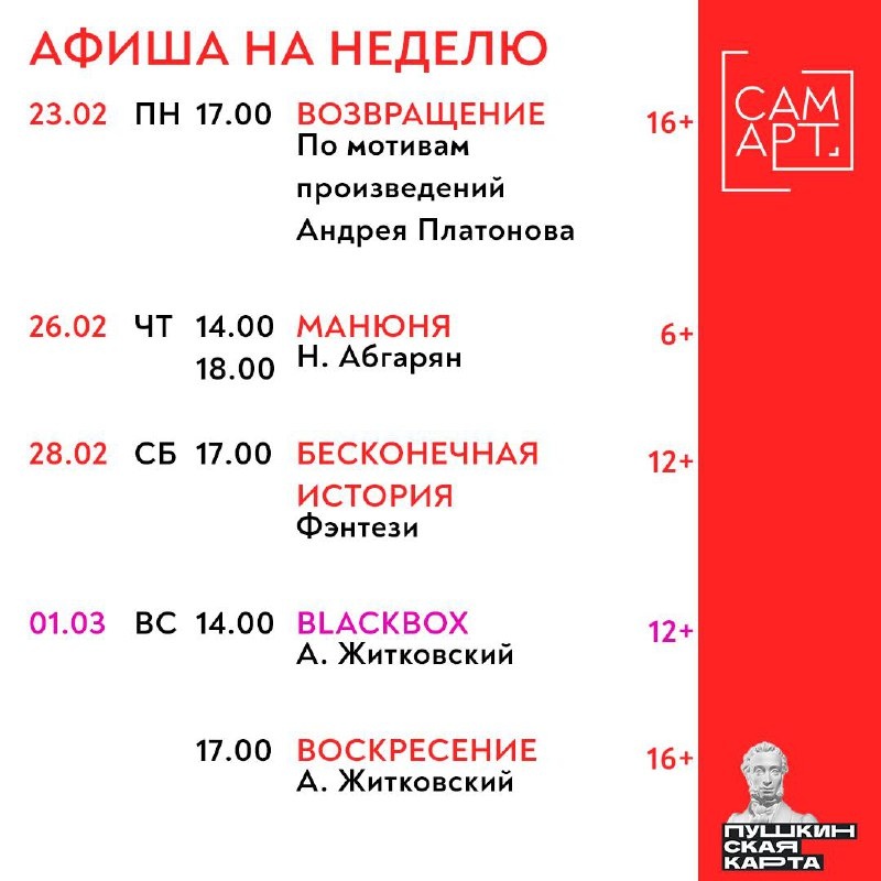 Разбираемся, куда и с кем идти: Идём со своим защитником: 🟥 «Возвращение» | 16+ 23 февраля | 17:00 Купить билеты Идём со всей семьёй: 🟥 «Манюня» | 6+ 26 февраля | 14:00 и 18:00 21 апреля | 14:00 и 18:00 Купить билеты 🟥 «Бесконечная история» | 12+ 28 февраля | 17:00 5 и 12 апреля | 17:00 Купить билеты Идём с друзьями: 🟪 «BLACKBOX» | 12+ 1 марта | 14:00 16 апреля | 18:00 Купить билеты Идём со своей второй половинкой: 🟥 «Воскресение» | 16+ 1 марта | 17:00 11 апреля | 17:00 Купить билеты