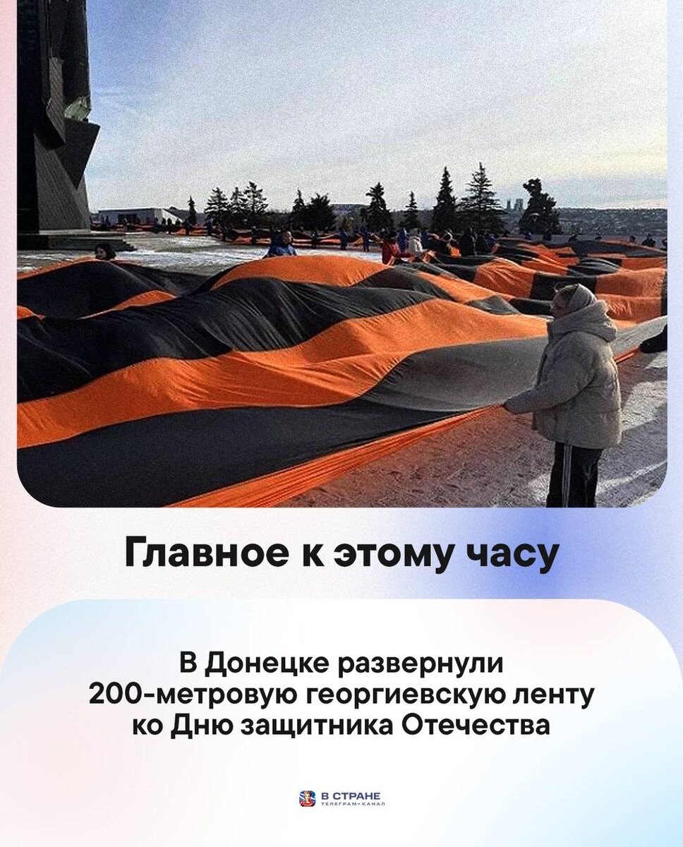 : 🔹В Донецке развернули 200-метровую георгиевскую ленту ко Дню защитника Отечества. 🔹Минпросвещения подготовит рекомендации по воспитанию детей. 🔹Российские космонавты Сергей Микаев, Сергей Кудь-Сверчков и Андрей Федяев с МКС поздравили россиян с Днем защитника Отечества. 🔹Льготы на авиабилеты для детей расширят, а невозвратные билеты можно будет вернуть. 🔹Россияне смогут установить самозапрет на азартные игры с сентября 2026. ✅ «В Стране» в MAX