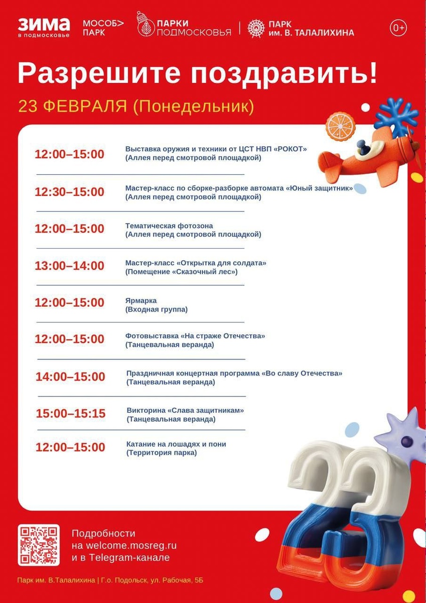 ✨ 23 февраля в парке им. В. Таллалихина с 12:00 до 16:00 🤍 12:00-15:00 — Выставка оружия 💙 12:30-15:00 — Мастер-класс по сборке-разборке автомата 🤍 13:00-14:00 — Мастер-класс "Открытка для солдата" (Помещение "Сказочный лес"); 💙 12:00-15:00 — Ярмарка ❤️ 12:00-15:00 — Фотовыставка "На страже Отечества" 🤍 14:00-15:15 — Концерт и викторина (Танц веранда); ❤️ 12:00-15:00 — Катание на лошадях и пони (Территория парка). 🚫 Возраст: 0+ 📆 23.02.2026 🏢 Парк культуры и отдыха им. В. Талалихина 📍 г. Подольск, ул. Рабочая, 5Б 💰 Вход свободный❗️ ⭐Поддержать канал голосом 🍰Где поесть в Подольске ✅ Мероприятия Подольск https://dzen.ru/id/66ed500f7b5671493eca3fd6 http://vk.com/podolsk_events http://dzen.ru/podolsk_events