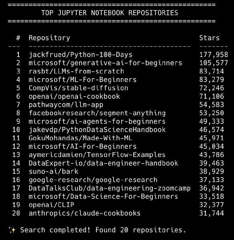 1. Generative AI for Beginners Полноценный курс от Microsoft: Jupyter-ноутбуки, практические задания и разработка GenAI-приложений. https://github.com/microsoft/generative-ai-for-beginners 2. LLMs from Scratch Пошаговая реализация GPT-подобной модели с нуля. Лучший способ понять, как работают LLM внутри. https://github.com/rasbt/LLMs-from-scratch 3. AI Agents for Beginners Практика по созданию агентных систем: инструменты, память, планирование, workflow. https://github.com/microsoft/ai-agents-for-beginners 4. ML for Beginners Классическая база по машинному обучению: 26 структурированных уроков. https://github.com/microsoft/ML-For-Beginners 5. OpenAI Cookbook Официальные примеры работы с API: production-паттерны, RAG, функции, реальные кейсы. https://github.com/openai/openai-cookbook 6. Python 100 Days Интенсив по Python с практикой каждый день. Отличная база для входа в AI. https://github.com/jackfrued/Python-100-Days 7. LLM App Templates Готовые RAG-шаблоны и production-решения