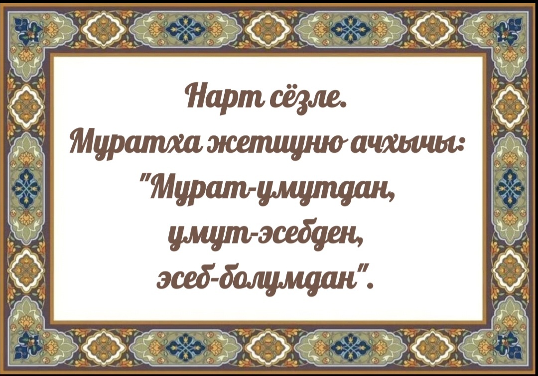 Халкъ акъылманлыкъны аллай инжи бюртюклеринден бири: «Мурат-умутдан, умут-эсебден, эсеб-болумдан»деген нарт сёздю. («Мечта от надежды, надежда от плана, план от возможности»).