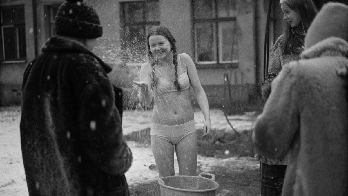 Раннее утро. Солнце ещё не решило - вставать или нет. Снег на земле плотный, слежавшийся, с голубоватым отливом. А она стоит - в одном купальнике, плечи расправлены, голова чуть запрокинута. Ведро с водой уже опрокинуто. Секунду назад по её спине прошёл целый водопад - ледяной, безжалостный, настоящий.