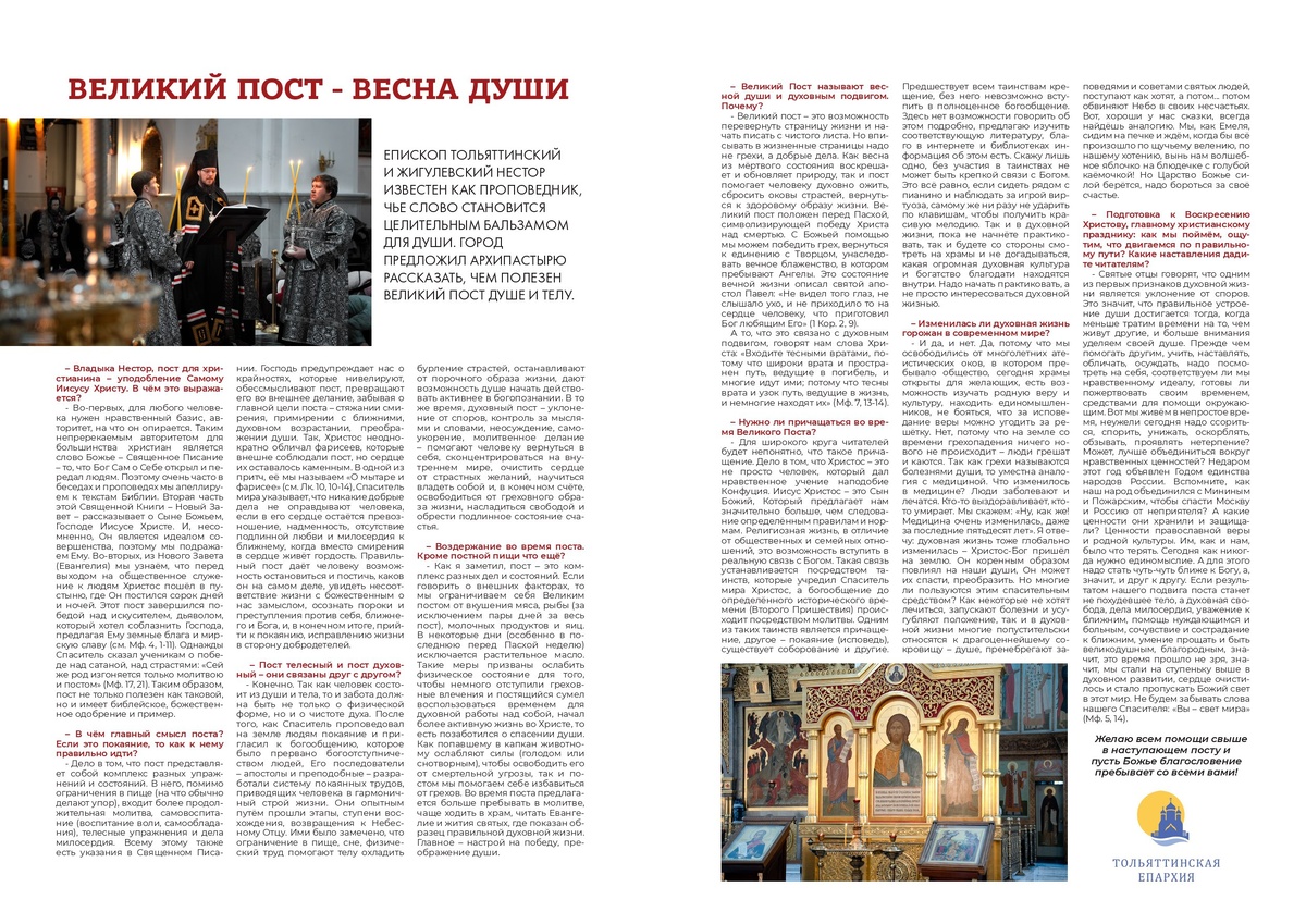 » В журнале «ГОРОД» вышла статья под названием «Великий пост – весна души», в которой опубликовано интервью епископа Тольяттинского и Жигулёвского Нестора. В беседе с журналистами архипастырь рассказал о духовном смысле Великого поста, его библейских основаниях и значении для современного человека. Читать: https://tltepar.ru/novosty/2026/02/velikiy-post-vesna-dushi-v-zhurnale-gorod-.html