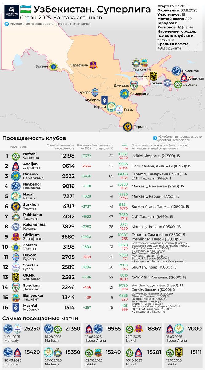 Прошлый сезон стал достаточно важной вехой в узбекистанском клубном футболе. Вслед за международными успехами (выход главной сборной на ЧМ-2026, победа на молодёжном Кубке Азии U20 в 2023-м, участие на ЧМ-2024 по футзалу) последовала реформа внутреннего чемпионата с расширением до 16 команд. И только два региона страны из 14 не были представлены командами в Суперлиге. Однако, как кажется со стороны, не все клубы были готовы к участию в Суперлиги именно с точки зрения инфраструктуры: Вдобавок ко всему этому проблемы с домашними аренами у столичных клубов. У главного гегемона «Пахтакора» (16 чемпионств в РУз) стадион закрыт на реконструкцию. А главная арена страны «Бунёдкор», где играла одноимённая команда, выбыла из эксплуатации почти на половину сезона из-за концерта Дженнифер Лопес и последующего вымирания газона после этого громкого события. Логично, что самыми популярными и посещаемыми командами стали те, кто постоянно играет на своём стадионе. И преимущественно это коллективы из Фе
