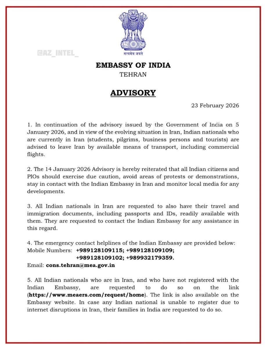 Индийское посольство в Тегеране выпустило срочное предупреждение, в котором призывает всех граждан Индии в Иране, включая студентов