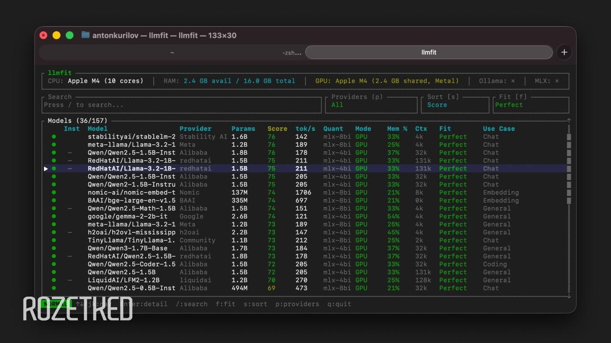 Консольная утилита LLMFit сортирует более сотни открытых LLM, исходя из ресурсов процессора, графического ускорителя и оперативной памяти. При установленной Ollama также можно сразу скачать и протестировать выбранную модель. LLMFit доступна для Windows, macOS и Linux. 💼 Rozetked | Подписаться