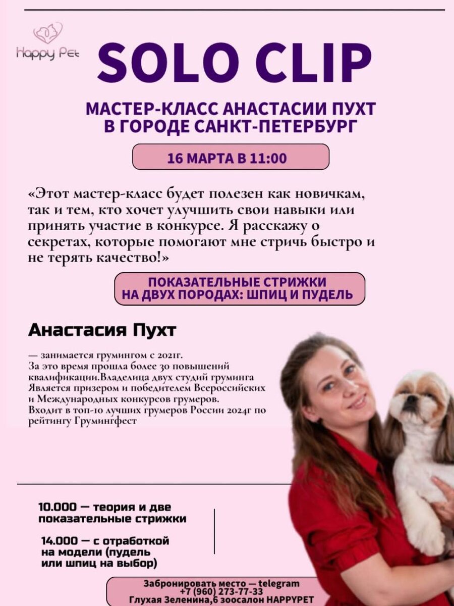 🌷 Мастер-класс «Solo Clip» Анастасии Пухт Что вы получите от мастер-класса ⬇️ 1. Разберем основные ошибки в стрижке машинкой с ниспадающим и объемным типом шерсти! 2. Три вида техники стрижки машинкой 3. Алгоритмы стрижки которые ускоряют процесс. 4. Личные лайфхаки 5. ПОДГОТОВКА К КОНКУРСУ(расскажу секреты) 6. Как чистая черновая стрижка ускоряет процесс и в каких случаях лучше не трать на нее свое время. 7. Как подстричь ЛЮБУЮ шерсть быстро и без ножниц 8. Подбор косметики и инструментов 9. Ответы на ваши вопросы и разбор типичных ошибок. Этот мастер-класс будет полезен как новичкам, так и тем, кто хочет улучшить свои навыки или принять участие в конкурсе. Я расскажу о секретах, которые помогают мне быть стричь быстро и не терять качество! Почему стоит прийти? • Получите практические навыки и лайфхаки от профессионала. • Узнайте о последних трендах в мире груминга. • Найдите единомышленников и расширьте свою сеть контактов! По таймингу: Теория, 2 показательных