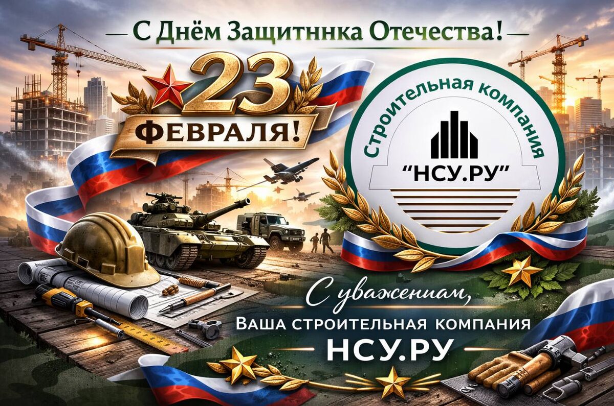 ! Поздравляем вас с Днём защитника Отечества! 23 февраля — это праздник силы, ответственности и надёжности. Это день людей, которые держат слово, принимают решения и отвечают за результат. В строительстве, как и в защите Родины, важны дисциплина, характер и командная работа. Мы ценим тех, кто умеет брать на себя ответственность, строить будущее и быть опорой для своей семьи, коллектива и страны. Желаем вам крепкого здоровья, твёрдости духа, уверенности в завтрашнем дне и больших побед — в работе и в жизни. С уважением, Строительная компания «НСУ.РУ»