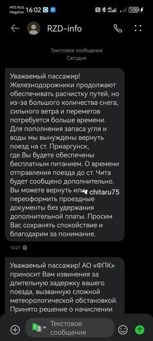 «Теперь еще и друг на друге поедем». Сейчас поезд №301 возвращают со станции Арабатук, где он встал вчера вечером, в Приаргунск. Там состав пополнит запасы угля и воды, а в 18:00 снова поедет в Читу. Пассажирам пришла рассылка о том, что к ним подсадят людей из встречного поезда, который не успел приехать из-за непогоды: Ввиду ограниченной вместимости состава возможны временные неудобства, связанные с уплотненной посадкой. По станции Борзя запланирована прицепка дополнительных вагонов для размещения пассажиров. Люди смогут вернуть или переоформить билеты без доплат. Им также начислят по 4 тысячи бонусов. Скриншоты от пассажиров 🟦 Быть на связи в MAX