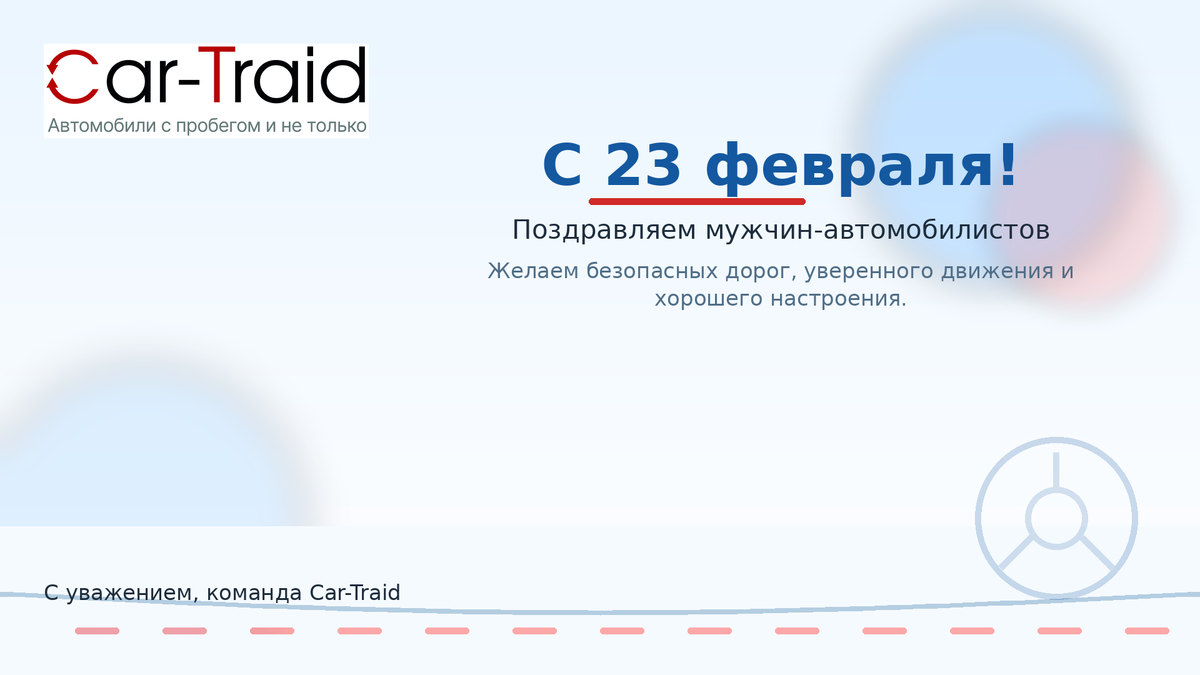 23 февраля — день, когда мы поздравляем тех, кто умеет брать на себя ответственность, принимать решения и доводить дело до конца. Тех, на кого можно положиться. Для нас это еще и повод сказать вам спасибо за доверие. Вы приходите к нам не просто за транспортом. Вы ищете машину, с которой будете на одной волне. Которая не подведет в дальней дороге, заведется в мороз и просто будет радовать каждый день. Мы это понимаем и ценим. Хорошей погоды за окном и отличного настроения за рулем. Пусть навигатор всегда прокладывает удобные маршруты, светофоры встречают зелёным, а пробки обходят стороной. Ровной работы двигателя, спокойного звука мотора и уверенного запуска в любое время года. Уюта в салоне, чистых ковриков и аромата, который поднимает настроение. Машина — место, где проводишь много времени, и приятно, когда вокруг комфортно. Интересных попутчиков и теплых разговоров в дороге. Дальние поездки пусть запоминаются приятными моментами, а в машине всегда найдется место для тех, кто дорог.