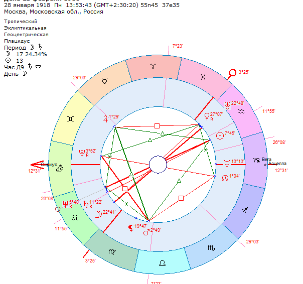 28 января 1918 года издается декрет о создании Рабоче-крестьянской красной армии(РККА). Здесь мы не видим сильно акцентированной военной темы, но мы видим Марс в Весах в трине с Юпитером и Солнцем, как бы сильное выделение темы офицеров- грамотных, честных, с широкими принципами гуманизма, как основы создания армии.