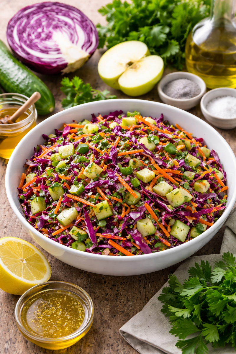 И самое удивительное что его делают из продуктов которые лежат у вас на кухне прямо сейчас. Если любите простые блюда с сильным эффектом, подпишитесь на телеграм канал «Вкус мира», там публикуются быстрые гастрономические находки без сложных техник. В редакционной гастрономии есть негласная традиция. После длинных дегустаций сложных блюд команда готовит максимально чистую еду. Не ради диеты. Ради перезагрузки вкусовых рецепторов. Именно тогда появился этот витаминный салат. Он не задумывался как контент. Он оказался слишком вкусным чтобы остаться внутренним секретом кухни. Главный парадокс блюда в том что оно работает как усилитель энергии. После него нет сонливости. Наоборот появляется ощущение бодрости словно вы сделали прогулку на свежем воздухе. Профессиональные повара всегда держат в голове формулу четырех элементов: хруст