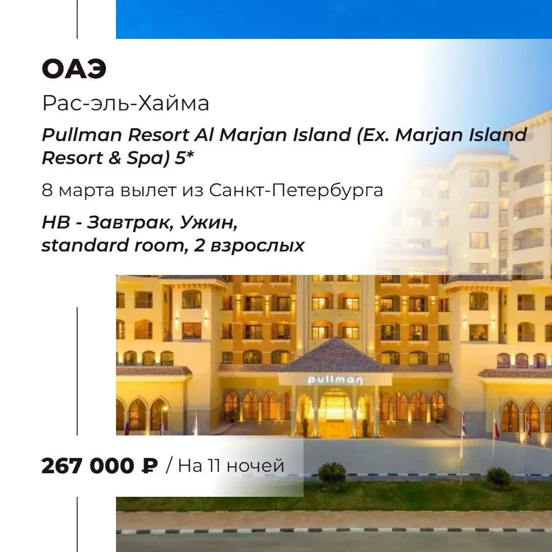 PULLMAN RESORT AL MARJAN ISLAND (EX. MARJAN ISLAND RESORT & SPA) 5* Курортный отель с элегантным дизайном, расположен на искусственном острове Marjan Island в окружении прозрачных вод Персидского залива. К услугам гостей частный пляж, спа-центр и клиника красоты, рестораны, оборудование для водных видов спорта, теннисный корт, а также просторные номера и люксы. Для детей работает Пиратский клуб с игровыми автоматами, есть игровая площадка. Подойдет для семейного отдыха, а также для любителей здорового и активного образа жизни. Столько троп еще не пройдено и столько маршрутов не изведано, надо успевать! 📱 Telegram 👉🏻 @VintageTravelSpb 📱 Max 👉🏻 +7 (911) 921-11-42 или https://clck.ru/3RTbjx