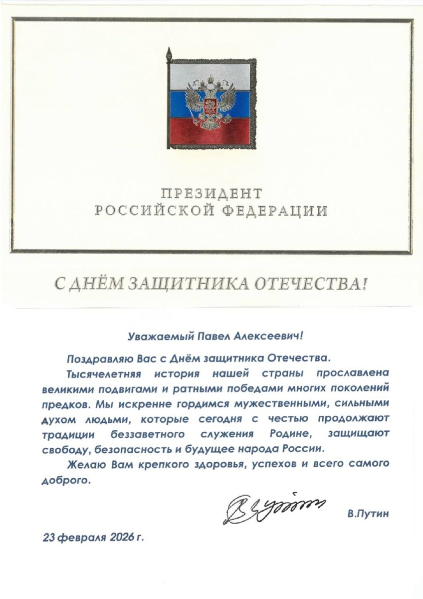 В поздравительной открытке на имя главы ПКР Павла Рожкова говорится: Уважаемый Павел Алексеевич! Поздравляю Вас с Днём защитника Отечества. Тысячелетняя история нашей страны прославлена великими подвигами и ратными победами многих поколений предков. Мы искренне гордимся мужественными, сильными духом людьми, которые сегодня с честью продолжают традиции беззаветного служения Родине, защищают свободу, безопасность и будущее народа России. Желаю Вам крепкого здоровья, успехов и всего самого доброго. 😄Подписаться на ПКР/ Поддержать канал голосом