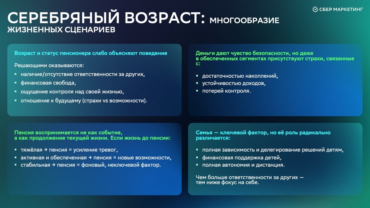 Я давно посматриваю на тренд серебрянной экономики, а тут попался отчет Сбера про серебрянный возраст. Давайте посмотрим, что там интересного Цель исследования: понять, как на самом деле живёт, думает и принимает решения аудитория 55-75 лет, чтобы бренды могли выстраивать с ней релевантное и долгосрочное взаимодействие. // сразу отмечу, что 16 этнографических глубинок проходили в Мск и Кирове. Насколько это репрезентативно и говорит всю РФ — большой вопрос. Но количественник из 2 тыс. анкет, тч мб и норм. 🌸 Сначала отметим, что 55-75 это аудитория и тех, кто работает и пенсионеров, которые могут работать или не работать (выход на пенсию в 64М и 59Ж лет). // Сегментация по возрасту -- это базовый сценарий, но мы увидели, что сегментов много и паттерны поведения у них разные. 🌸 Люди стали больше готовиться к выходу на пенсию, планируют на что они будут жить, чем будут заниматься. Прогноз более позитивный, чем оно бывает на самом деле на пенсии. // Да у меня знакомые и в 30 уже на