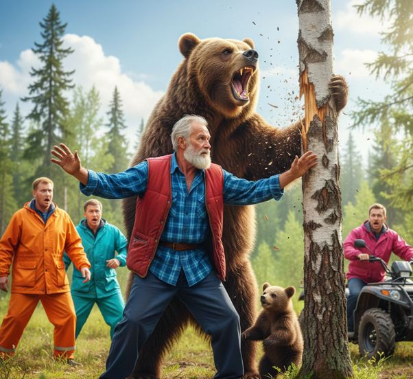 Лесной воздух разорвал оглушительный, вибрирующий рев, от которого с ближайшей сосны сорвалась стая ворон. Надя вскинулась на задние лапы, превратившись в трехметровую гору литых мышц. Хищница сделала тяжелый, пружинистый шаг вперед. Она показывала зубы, а с губ капала густая слюна. Медведица с размаху ударила передними лапами по толстому стволу сухой березы. Дерево угрожающе хрустнуло, осыпая людей трухой и мелкой щепой.