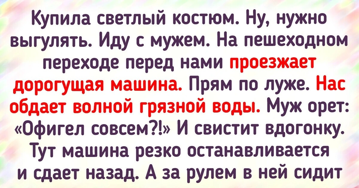 Купила светлый костюм. Ну, нужно выгулять. Иду с мужем. На пешеходном переходе перед нами проезжает дорогущая машина. Прям по луже. Нас обдает волной грязной воды. Муж орет: «Офигел совсем?!» И свистит вдогонку. Тут машина резко останавливается и сдает назад. А за рулем в ней сидит "накачанный шкаф". Опускается стекло, и он выдает: «Извините, пожалуйста! Я случайно!» Моей коллеге 50 лет, и однажды она застряла в пробке на мосту. В какой-то момент её автомобиль немного откатился назад и задел машину, которая стояла позади. Водитель той машины вышел выяснять, что произошло. Коллега слегка опустила стекло и заявила: «Это не я в вас въехала, это вы ко мне прижались!» И неожиданно он ответил: «Я понял, извините». Это случилось в далёком 2011 году. Я тогда работал в шиномонтаже, спокойно сидел на месте, никого не трогал, как вдруг вбегает девушка и спрашивает: «Здравствуйте, а вы моего Васю переобуете?» Я опешил и переспросил: «В смысле? Какого ещё Васю?!» Она объяснила: «Ну, мою машину зову