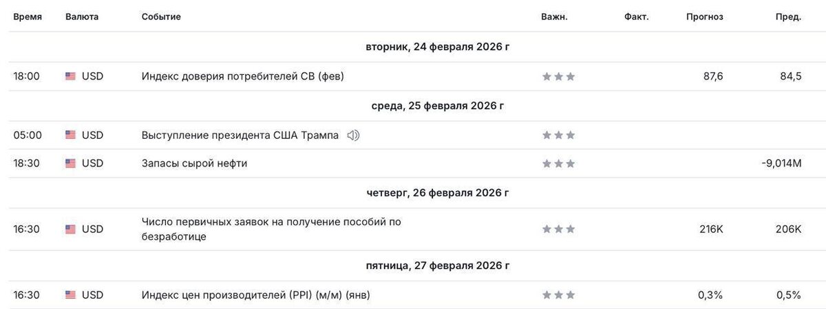 Первое — выступление Трампа. Любой сигнал по тарифам, бюджету или промышленности и рынки дёрнутся. Жёсткая риторика это больше конфликтов, давление на торговлю, рисковые активы вниз. Второе — заявки по безработице. Быстрый пульс рынка труда: больше заявок значит экономика остывает и рынки начинают ждать снижения ставок. Меньше заявок — экономика всё ещё бодрая, и вопрос “а точно пора?” снова открыт. Третье — PPI, цены производителей. Дорожает производство — значит через время дорожает и в магазине. Если PPI ускорится, инфляционное давление возвращается и рынки нервничают. Главная мысль: рынку нужен мягкий сценарий — экономика тормозит, но без нового инфляционного удара. Если данные выйдут спокойно, ожидания снижения ставок сохранятся.