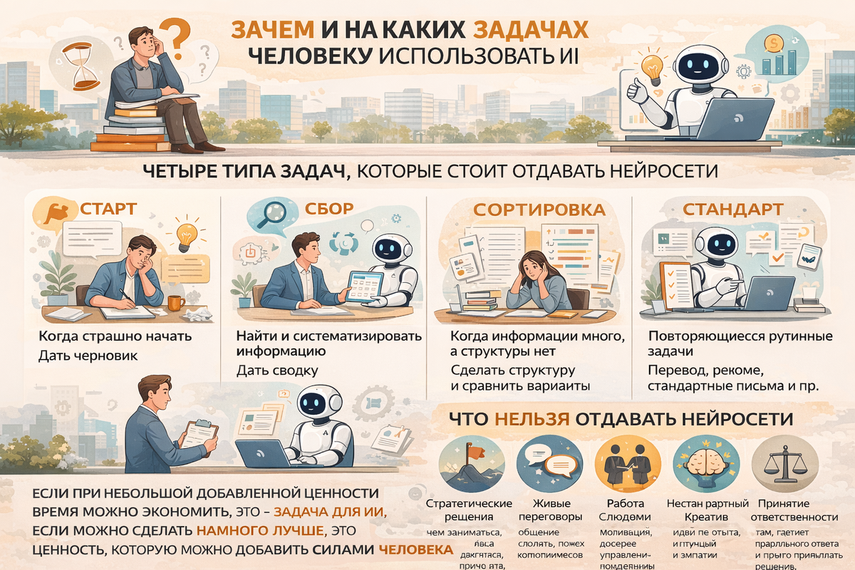 Есть один парадокс, который замечают все, кто начинает работать с нейросетями. Человек радостно отдаёт ИИ что-то важное - стратегическое решение, сложные переговоры, тонкий разговор с клиентом. И искренне удивляется: почему результат такой... никакой? А потом часами сам переписывает очевидный черновик, сам ищет в интернете данные, которые любая нейросеть собрала бы за минуты.