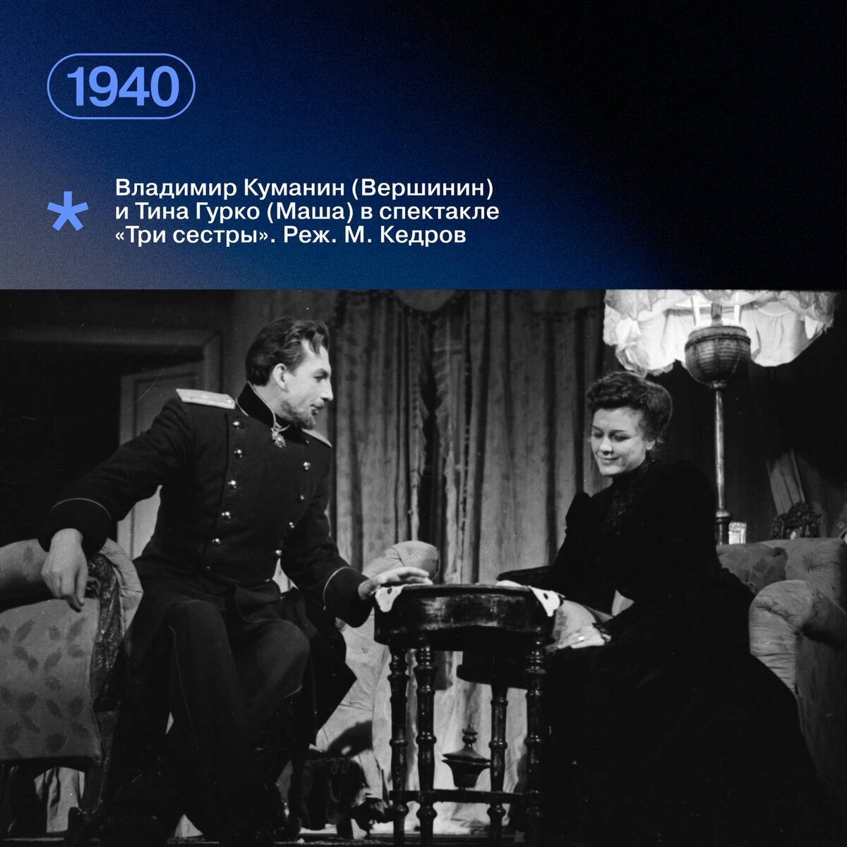 💥 В спектакле 1944 года «Наташа Москвина» (реж. В. Топорков) образ «пропавшего без вести» командира, возглавившего в тылу врага партизанский отряд, был основан на свежих наблюдениях авторов пьесы, фронтовых корреспондентов С. Михалкова и Н. Кружкова, и вселял женам надежду на возвращение близких. В 1973 году, когда военная тема давно ушла на периферию внимания, главный герой пьесы И. Дворецкого «Трасса» (реж. В. Кузенков) генерал в отставке, возглавив крупную стройку, по-военному («сделать или умереть») решал производственные проблемы в конфликте с профессиональными инженерами. В 1995 году в спектакле по запрещенной в советское время пьесе Б. Васильева «Начало» (реж. В. Ланской) под сомнения ставилась официальная трактовка событий накануне войны: ее главный герой, генерал-пограничник, мучался от бессилия: его спасительные действия были трагически парализованы высшим командованием. Но еще, конечно, были чеховские офицеры Вершинин, Тузенбах и Соленый, влюбленные в сестер Прозоровых;