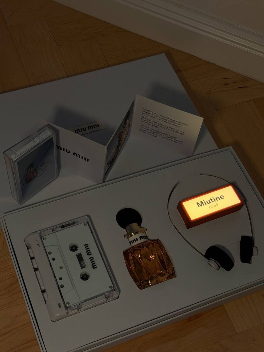 В рассылке блогерам с новым ароматом - проводные наушники и кассетный проигрыватель. На магнитной ленте - послание от Эммы Корин про то, как важно любить себя. Инструкцию по применению зумерам заботливо вложили. Тоже захотелось такой красивый компактный магнитофон, чтобы кляцать кнопками и перематывать туда-сюда. Но у меня, как у миллениала, все же случился инсайт. В комплекте презента Miu Miu - адаптер, он коннектится с телефоном, можно запись с телефона послушать на кассете. Кайф! Оказывается, на маркетплейсах продаются кассетные адаптеры, в основном для автомагнитол (у кого они еще остались). И портативные кассетные плейеры - тоже, только уже с современными технологиями, например, с блютузом, чтобы переносить музыку на другое устройство. Но аналоговое звучание - то самое. Вишлист