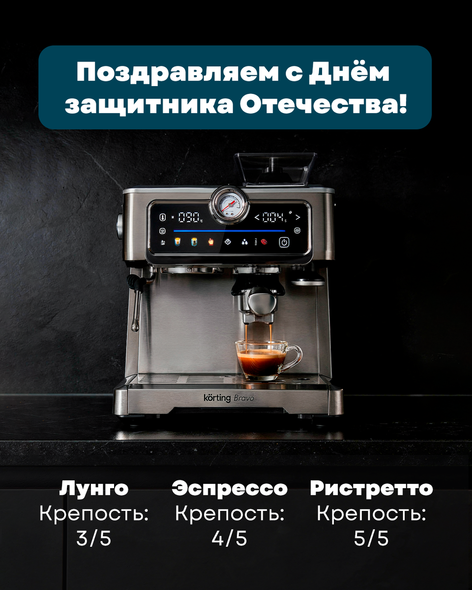 Поздравляем с Днём защитника Отечества! В честь этого праздника устройте со своей половинкой дегустацию крепких кофейных напитков. Самые насыщенные из них представлены на картинке — отличный повод открыть новые кофейные вкусы! Приготовить эти и другие кофейные напитки вам поможет кофейная станция Korting KCM 1013 SA Bravo. Подробнее о её возможностях можно узнать по ссылке: https://clck.ru/3RxRci