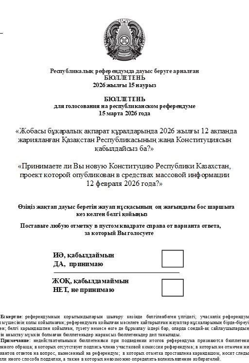 На втором заседании ЦИК представители продемонстрировали гражданам, как будет выглядеть бюллетень для референдума по новой Конституции Казахстана. Организаторы использовали шрифт Брайля, чтобы сделать бюллетень доступным для людей с нарушением зрения. Согласно представленному макету, граждане смогут голосовать на республиканском референдуме 15 марта 2026 года. https://dzen.ru/id/65c879adfcd0940ad7548a95