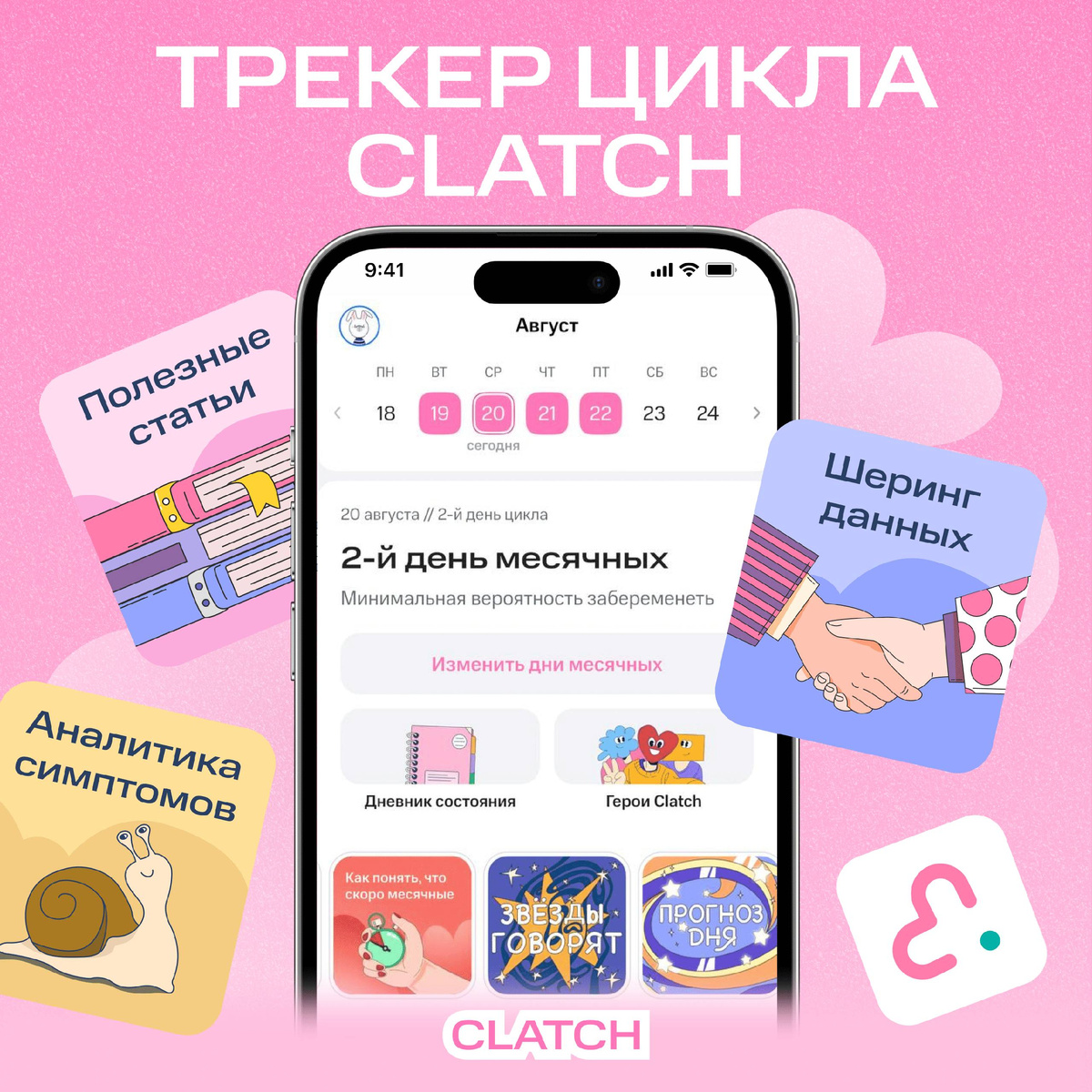 Clatch — удобный и бесплатный трекер менструального цикла с дневником самочувствия, напоминаниями и аналитикой. Скачайте бесплатно! Зачем нужен трекер менструального цикла Регулярность менструального цикла — один из главных показателей женского здоровья. Однако держать в голове даты, симптомы и фазы цикла непросто. Именно поэтому миллионы женщин выбирают цифровые трекеры, которые автоматически рассчитывают дни овуляции, фертильное окно и приближение месячных. Одним из самых удобных решений на российском рынке стало приложение Clatch — бесплатный женский календарь менструаций и овуляций с рейтингом 4,7★ и 3 миллионами установок. Clatch уже пользуются полтора миллиона девушек, которые отслеживают овуляцию, ПМС, планируют беременность. Что умеет Clatch Clatch — это не просто календарь месячных. Это полноценная платформа для мониторинга женского здоровья. Вот что доступно в приложении: · Календарь цикла — отмечайте начало и окончание месячных, а приложение автоматически рассчитает длину ц