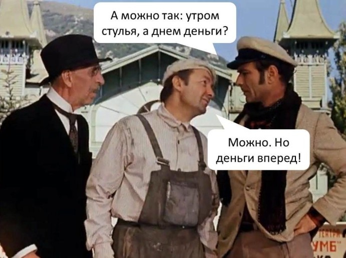 Бесконечно обаятельный монтер Мечников (в исполнении гениального актера Вицина) выдает поражающую своим логическим парадоксом формулу. Вот уже как минимум два, а то и три поколения наших соотечественников с выражением восторга ее повторяют: «Можно, но только деньги вперёд!» А ведь перед нами опустившийся ворюга, сбывающий во имя очередной выпивки ценный инвентарь. Гамбсовские стулья, как мы знаем из текста, были составной частью декораций авангардистской интерпретации классической пьесы. Пьянство сотрудника зримо нарушало авторский замысел, потенциально приносило урон сборам, отрицательно сказывалось на заработках творческого коллектива.