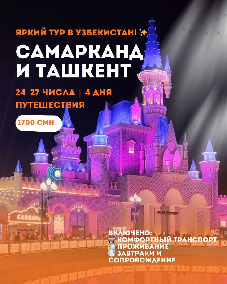 ✨ 🌍 Самарканд – Ташкент – Душанбе 📅 24–27 марта| 4 дня 💰 1700 сомони 🏛 Самарканд — древняя архитектура и восточная атмосфера 🌆 Ташкент — прогулки, шопинг и развлечения 🎡 Magic City & Seoul Park 🛍 Tashkent City Mall 🎭 Театр восковых фигур 🕌 Рынок Чорсу В стоимость включены: 🚌 Транспорт | 🏨 Проживание | 🍽 завтраки и сопровождение 📲 Мест мало — успей забронировать! И отправить этот пост друзьям 👌🏻 Осталось -5 мест