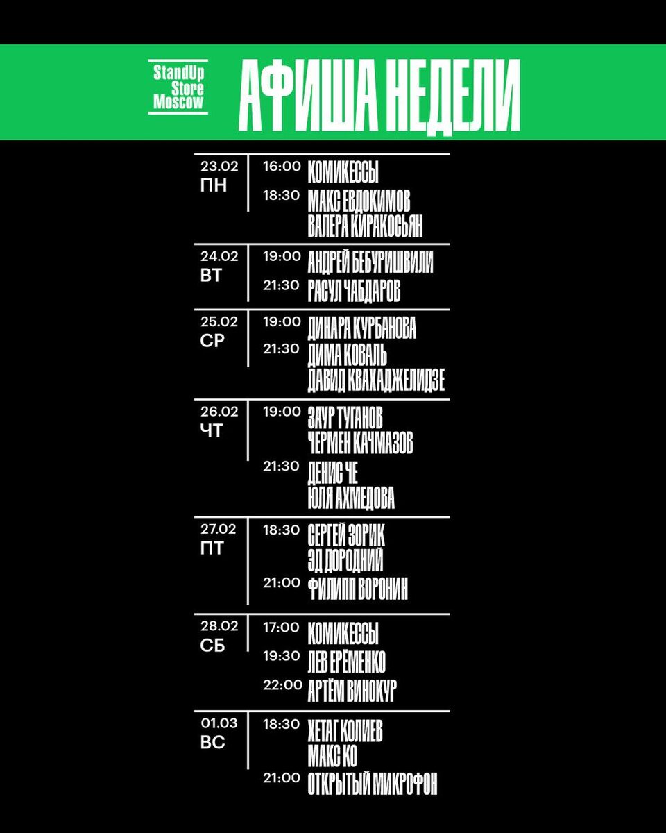 В понедельник, 23 февраля В 16:00 комикессы В 18:30 совместный концерт Макса Евдокимова и Валеры Киракосьяна В 21:00 открытый микрофон Во вторник, 24 февраля В 19:00 сольный концерт Андрея Бебуришвили В 21:30 сольный концерт Расула Чабдарова В среду, 25 февраля В 19:00 сольный концерт Динары Курбановой В 21:30 совместное выступление Димы Коваль и Давида Квахаджелидзе В четверг, 26 февраля В 19:00 совместный концерт Заура Туганова и Чермена Качмазова В 21:30 совместное выступление Дениса Че и Юлии Ахмедовой В пятницу, 27 февраля В 18:30 совместный концерт Сергея Зорика и Эда Дородниего В 21:00 сольный концерт Филиппа Воронина В субботу, 28 февраля В 17:00 комикессы В 19:30 сольный концерт Льва Еременко В 22:00 сольный концерт Артема Винокура В воскресенье, 1 марта В 18:30 совместное выступление Хетага Колиева и Макса Ко В 21:00 открытый микрофон 📍 Наш адрес: ул.Перровка, д.21с1, StandUp Store Moscow