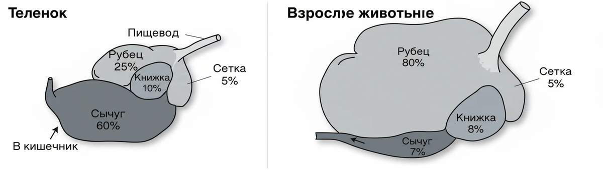 Почему в литературе по кормлению КРС часто встречается термин "вволю"? Беспрепятственный доступ молодняка к качественным кормам является фундаментом будущей продуктивности животного. По ссылке подробно эти принципы, https://dzen.ru/a/aZwXkaUO0mtRfhpZ, а также конкретные расчеты представлены в новой статье на Дзен-канале «Рацион телят 6–18 месяцев: нормы по живой массе и привесам». У теленка сычуг составляет 60% объема, рубец (где происходит микробное брожение клетчатки) — всего 25%. У взрослого животного рубец занимает 80% объема.Сычуг — лишь 7%. Без раннего и свободного доступа к грубым кормам рубец не получает необходимого стимула для роста.