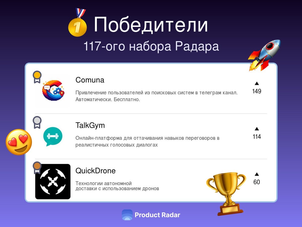 117-й набор 🥇 Comuna Привлечение пользователей из поисковых систем в телеграм канал. Автоматически. Бесплатно. 🥈 TalkGym Онлайн-платформа для оттачивания навыков переговоров в реалистичных голосовых диалогах 🥉 QuickDrone Технологии автономной доставки с использованием дронов Новый раунд стартапьих бегов и новые проекты уже на вашем Радаре!🌚 — ⭐️ Вы можете Поддержать Радар и получить значок «Друг Радара», а также доступ в закрытый канал и к базе знаний для развития стартапа с нуля — 📤СТАВЬТЕ РЕАКЦИИ: «🎉» – Урааааа! «🔥» - Все молодцы! «❤️» - Я голосовал(-а) за победителя
