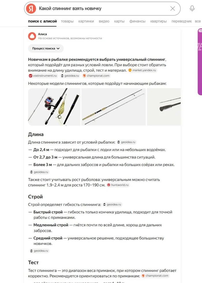 В Поиске с Алисой мы видим информацию про длину спиннинга, про строй бланка, про тест используемых приманок. Нам объясняется, что значит каждый из этих показателей и на что он влияет. По факту, нам сначала нужно определиться КАКУЮ рыбу мы будем ловить.