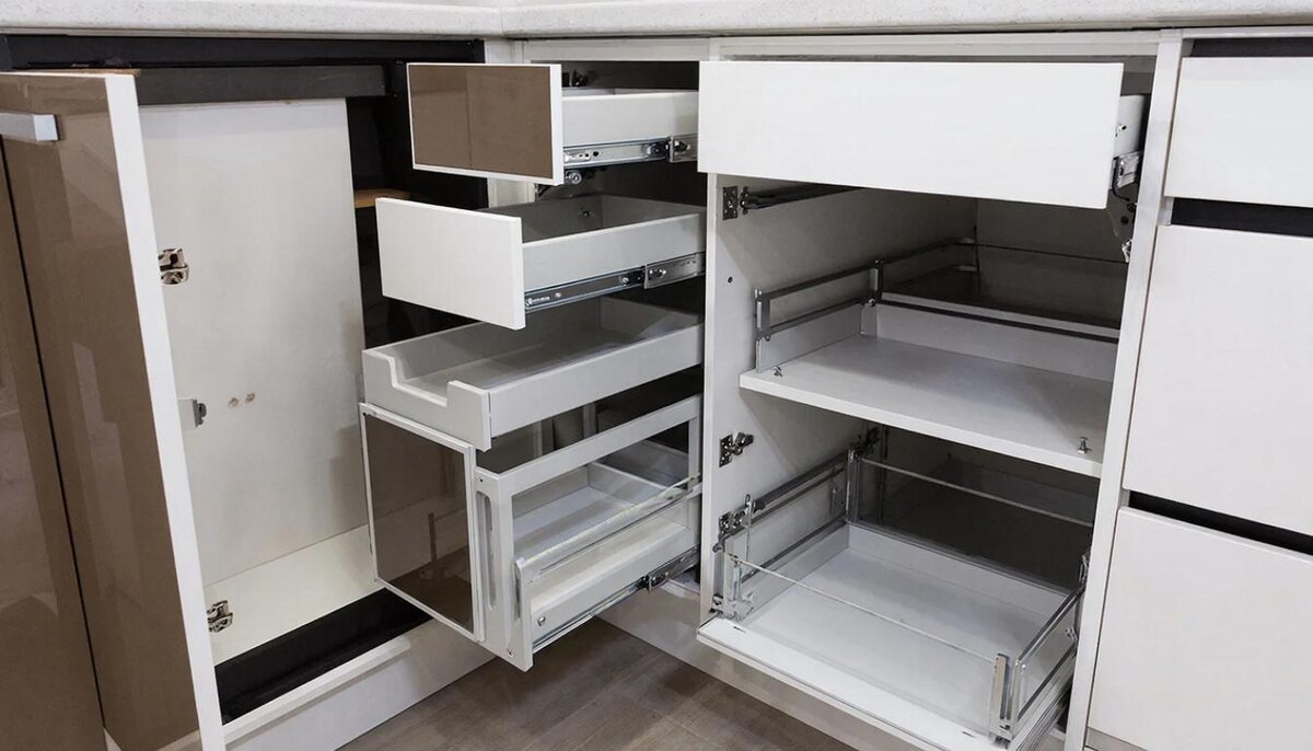 Обычные полки в углу – это выброшенное пространство. Туда складывают хлам, который потом не могут найти. Карусели (вращающиеся полки) и выдвижные системы («волшебный уголок») позволяют использовать каждый сантиметр и легко добраться до любой вещи. Они недешёвые, но это единственный способ сделать угол функциональным.