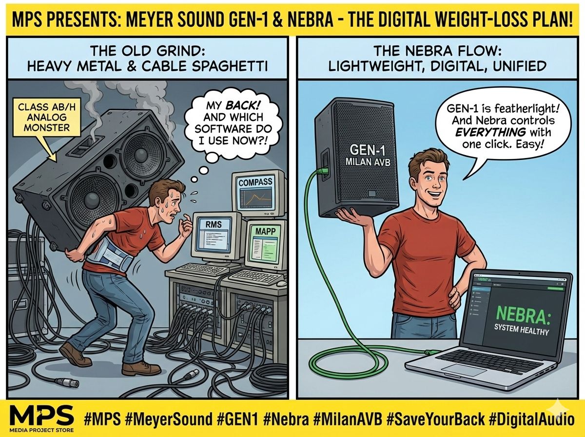 Внимание всем фанатам Meyer Sound! Мы знаем, что вы любите этот бренд за звук, но ненавидите его за вес. Таскать легендарные «активки» MILO или LEO — это спорт для сильных духом и спиной. Но времена меняются. Meyer Sound, которые уже лет 25 учат индустрию тому, что усилитель должен жить внутри колонки, совершили новый технологический скачок. Встречайте платформу GEN-1 и софт Nebra. Долгие годы Meyer Sound держались за аналоговые усилители класса AB/H. Они звучали божественно, но весили тонну. Переход на платформу GEN-1 (которая стоит в новых массивах PANTHER, сабах 2100-LFC и кинотеатральных ASTRYA) изменил правила игры. Раньше работа с Meyer Sound требовала жонглирования софтом: Compass для процессоров, RMS для мониторинга, MAPP для расчета. Новая платформа Nebra объединяет всё это в одну экосистему. Мы в Media Project Store снимаем шляпу. Meyer Sound не изменили себе — они остались верны концепции Self-Powered, которую продвигают десятилетиями. Но теперь они убрали главный недостаток