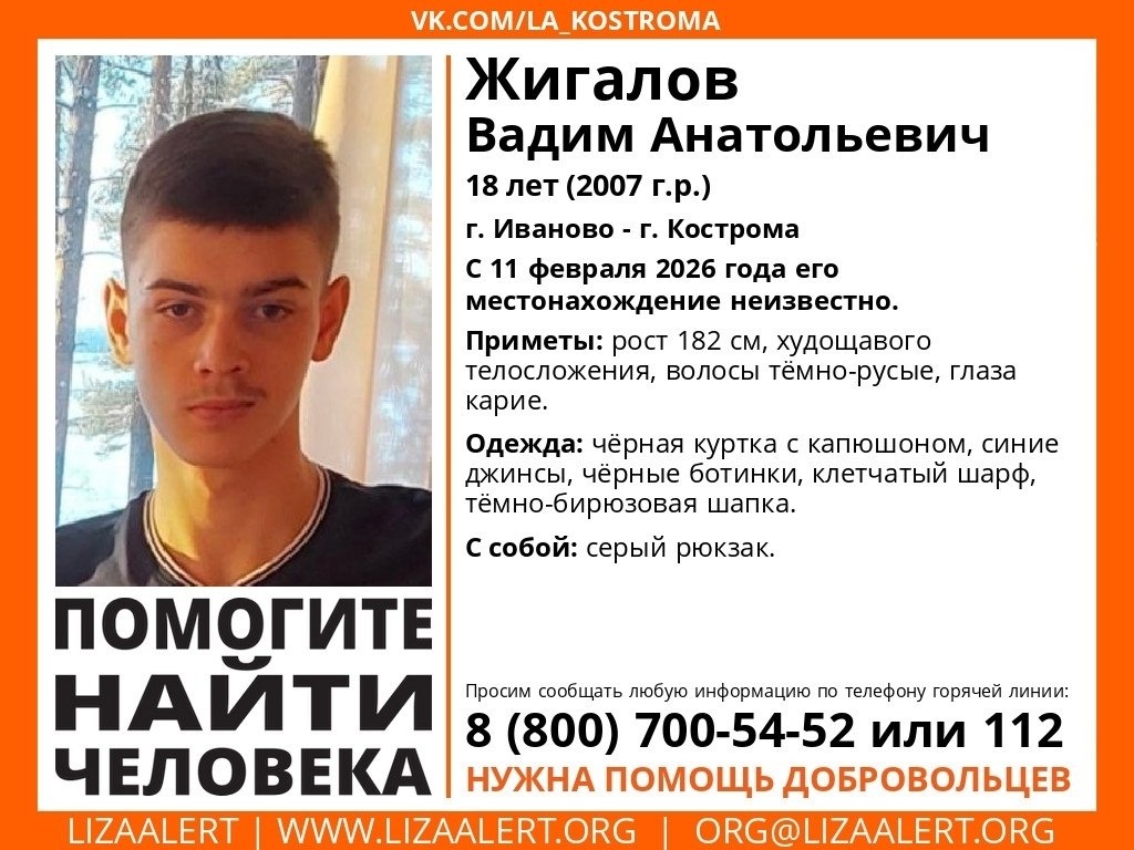 Требуется помощь добровольцев Поисковый отряд «ЛизаАлерт» обращается к жителям Ивановской области с просьбой помочь в поисках 18-летнего Вадима Жигалова. Парень пропал 11 февраля. Может находиться в Иванове или Костроме. Приметы: рост 182 см, худощавого телосложения, волосы темно-русые, глаза карие. Был одет в черную куртку с капюшоном, синие джинсы, черные ботинки, клетчатый шарф, темно-бирюзовую шапку. С собой был серый рюкзак. Всех, кто видел Вадима Жигалова или знает, где он может быть, просят звонить по телефону 8 800 700 54 52 или 112.