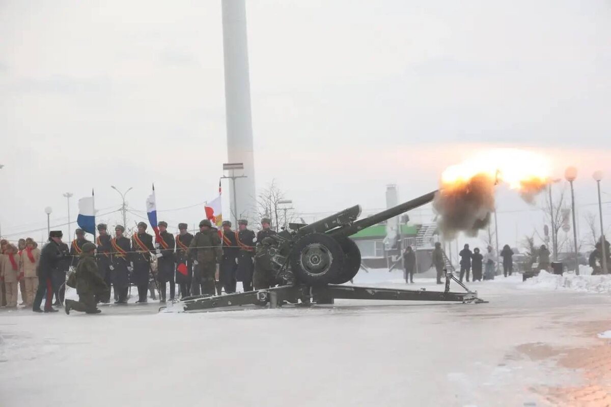 Торжественный полуденный выстрел из артиллерийского орудия в честь Дня защитника Отечества сегодня прогремел в Хабаровске.