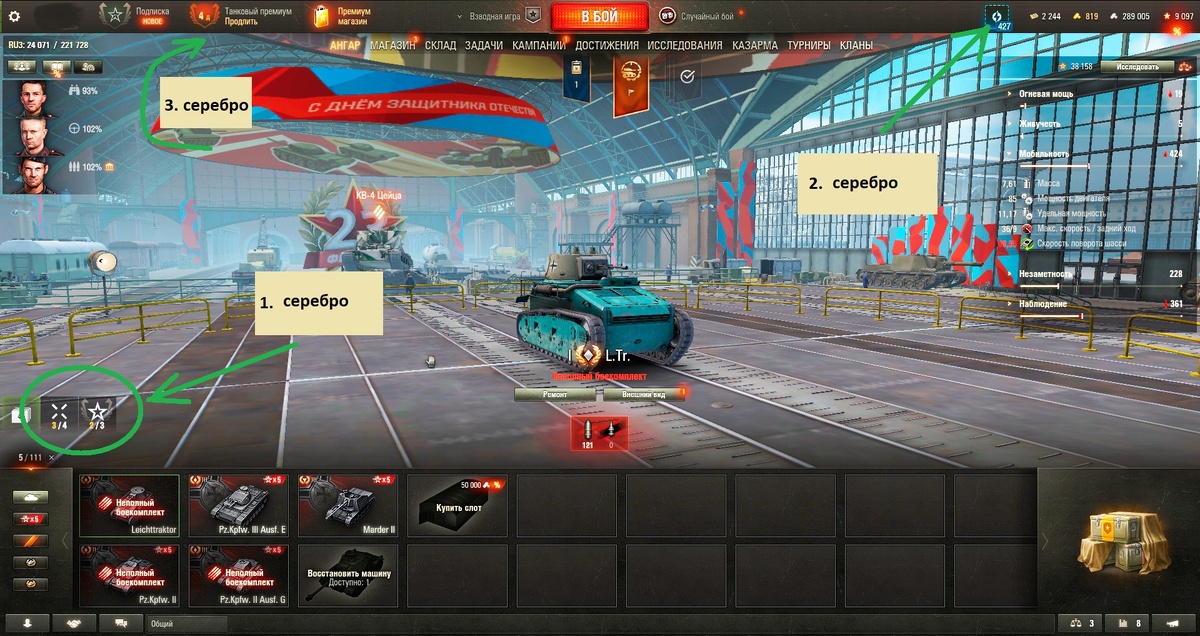 Всем привет. Сегодня кратко о путях зарабатывания большего количества "серебра" и чем в этом могут помочь 1-3 лвл?.. На картинке я показал стрелками три пути увеличения количества серебра: 1.Выполняя ежедневные стандартные или премиум задачи, и еженедельные в целом, мы можем быстрее добыть "серебро". Для этого стоит посмотреть награды за задачу и если там стоит "серебро", выполняем задачу. Вот тут как раз и могут пригодиться танки 1-3 уровней. Например, задача на "определенное количество критического урона" легко выполняется в боях с ботами. Неповоротливые боты так и подставляют бока. И "критический урон" легко им наносится. 2. Это конечно же увеличение бонусного "серебра" в этом отдельчике "Резервы". Мы нажимаем и включаем эти бонусы перед боем или даже во время боя. 3. Это дни "премиум-аккаунта", где "серебро" капает больше. А еще есть "Подписка", "Боевой пропуск", праздничные подарки, премиум-танки - и все это вместе тоже приносит больше "серебра". Ну и, конечно, чем больше вы в