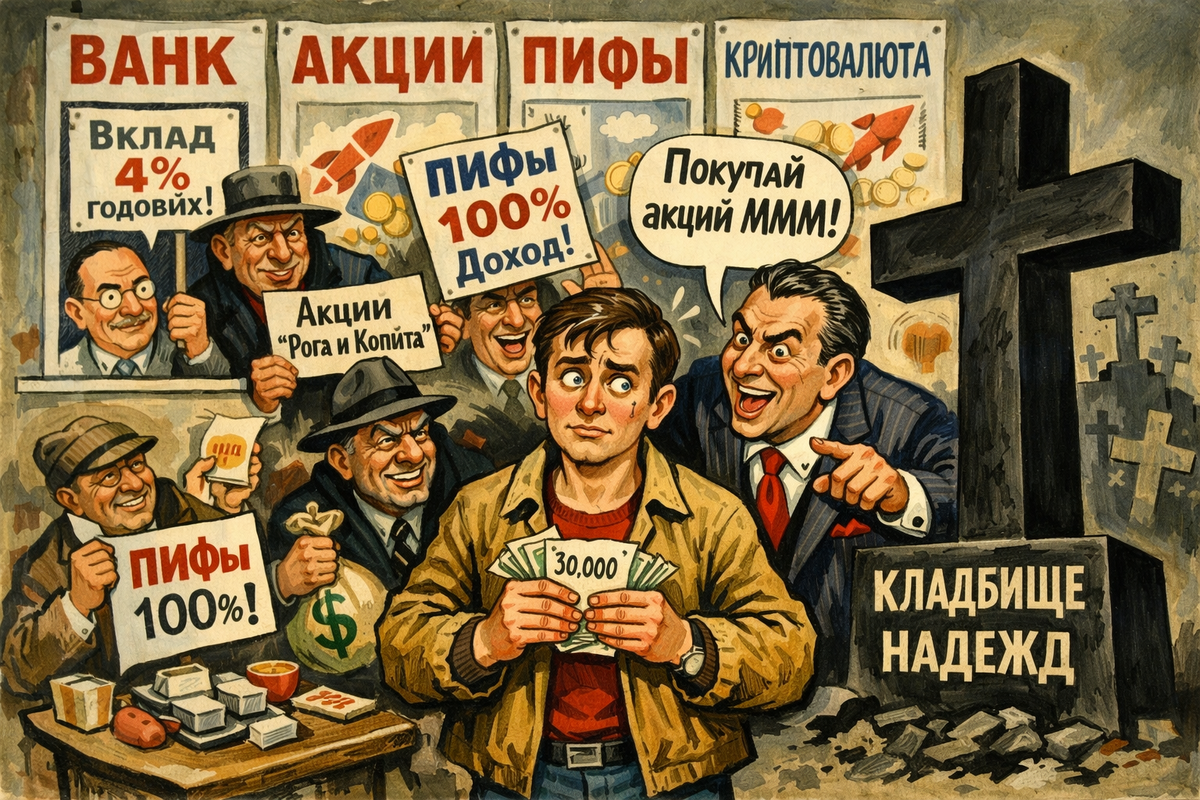 - «Бабкины инвестиции» и «Гарантия лоха». Если дядя в телеграме обещает 50% в месяц и показывает фото чужой яхты — бегите. Это не инвестор, это фокусник. Он сделает ваши деньги исчезающими прямо сейчас.
