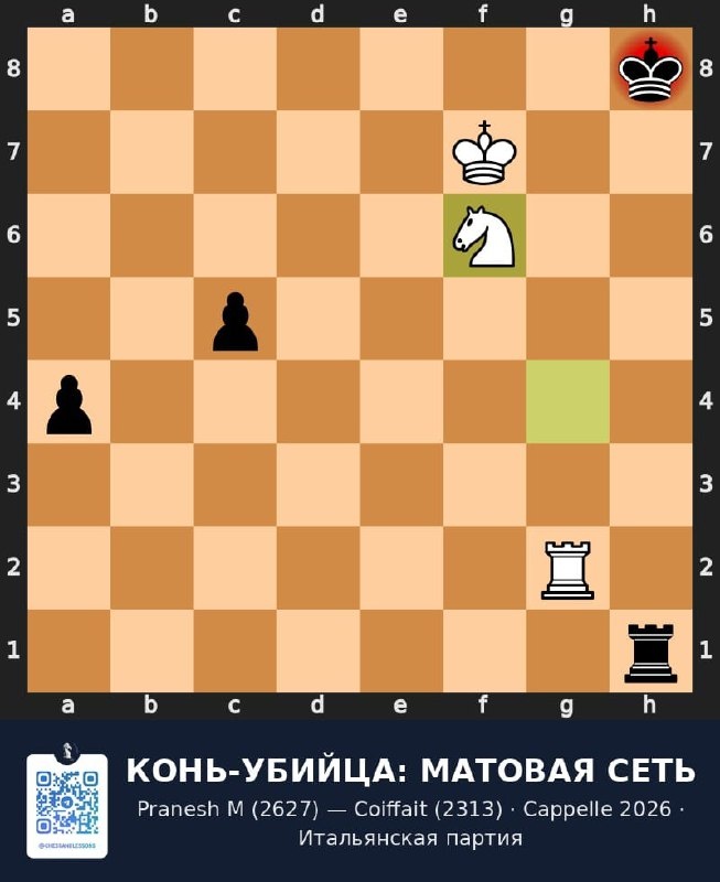 🇮🇳 Pranesh M (2627) — Coiffait (2313) 🇫🇷 42e Open de Cappelle 2026, 2-й тур · Итальянская партия Молодой индийский гроссмейстер Пранеш провёл ураганную комбинацию: 11.Кxe5! Кxg3 12.Сxf7+! Крf8 13.Кg6+! — двойной удар с выигрышем качества. Но дальше началось безумие! Пранеш зевнул е5?? (надо Фс4), потом упустил е8=Ф+! — шах и вскрытый удар конём, выигрывая ладью. Позиция стала равной. 61 ход цейтнотной борьбы, оценка скакала от +4 до 0 и обратно. Финал — шедевр: после 57...Крh6?? (надо Крh4!) Пранеш выстроил матовую сеть: Крf6! Крf7! Кg4! Кf6! — конь контролирует все поля отступления. Мат неизбежен! 📖 Разбор с комментариями: lichess.org/study/K3IGgk2c/qD75bTG6 #шахматы #chess #cappelle #итальянскаяпартия #мат #тактика