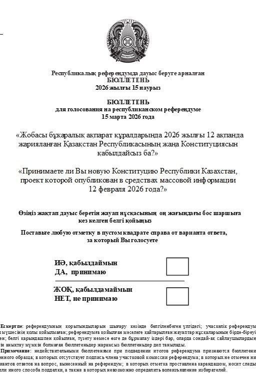 Центральная избирательная комиссия РК опубликовала форму и текст бюллетеней для голосования, передаёт Centralmedia24. 💬15 марта в Казахстане пройдёт референдум. Голосовать «за» или «против» новой Конституции приглашают всех граждан страны. 📌Ранее комиссия порекомендовала казахстанцам заранее позаботиться о включении их в списки голосующих. А также опубликовала аннотацию, где объясняется, кто может принять участие в референдуме и, как войти в списки «имеющих право голосовать». Фото: Центризбирком Присылайте фото, видео и информацию анонимно — в наш бот t.me/CentralMedia24_KZbot или на WhatsApp +77080323818 😎Следите за новостями тут: https://dzen.ru/id/67fc8dffe608bc669477821e