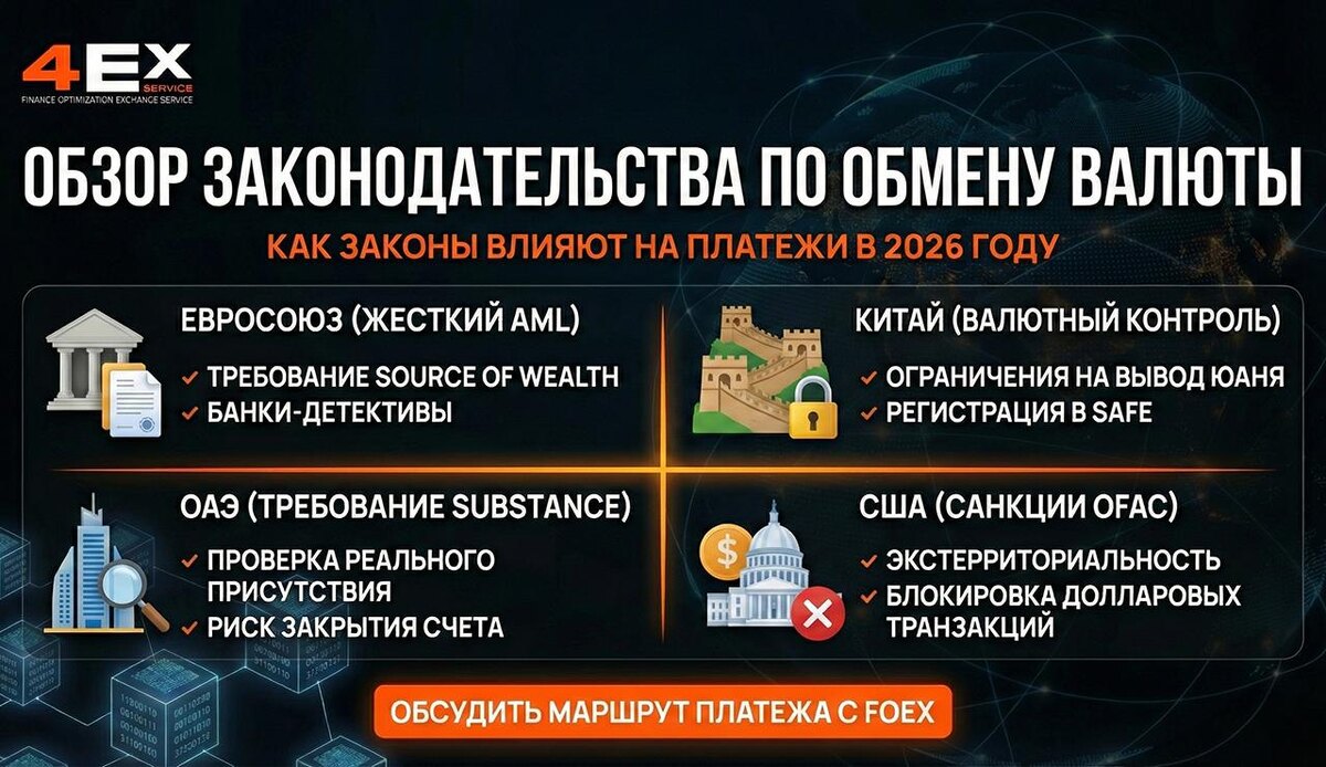 ? Вам кажется, что мир глобален и деньги летают по проводам мгновенно? Это иллюзия. На самом деле каждый международный перевод проходит через «минное поле» национальных законодательств. То, что законно в Европе, может привести к тюремному сроку в Китае или блокировке в США. Разберем, как законы разных регионов реально влияют на ваши платежи в 2026 году: 1️⃣ Евросоюз 🇪🇺 (Диктатура AML) Здесь нет валютного контроля (выводить можно сколько угодно), но есть жесточайший AML (Anti-Money Laundering). Как это влияет: Банк не пропустит платеж, пока не поймет природу денег. Законы требуют от банков быть детективами. Риск: Вас спросят не «почему вы платите», а «откуда у вас вообще эти деньги» (Source of Wealth). Без папки документов на дедовское наследство или продажу активов счет заморозят. 2️⃣ Китай 🇨🇳 (Великая Стена Капитала) В Китае действуют строгие ограничения на отток капитала. Юань не является свободно конвертируемой валютой. Как это влияет: Вы не можете просто так оплатить ин
