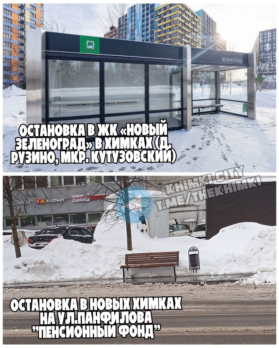 🚍 Новая остановка в ЖК «Новый Зеленоград» в Химках (д. Рузино, мкр. Кутузовский): она оснащена барным столиком, кофе-автоматом, розетками для зарядки гаджетов, системой обогрева и бесплатным Wi-Fi. 🚍 И остановка в новых Химках на ул.Панфилова "Пенсионный фонд": она оснащена лавочкой и урной 😅 💬 Как говорится - почувствуйте разницу...