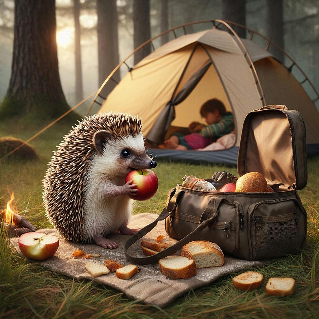 Ёж, не обращая на нас никакого внимания, продолжал своё чёрное дело. Он уже распотрошил пакет с сухарями и теперь пытался добраться до яблок.
