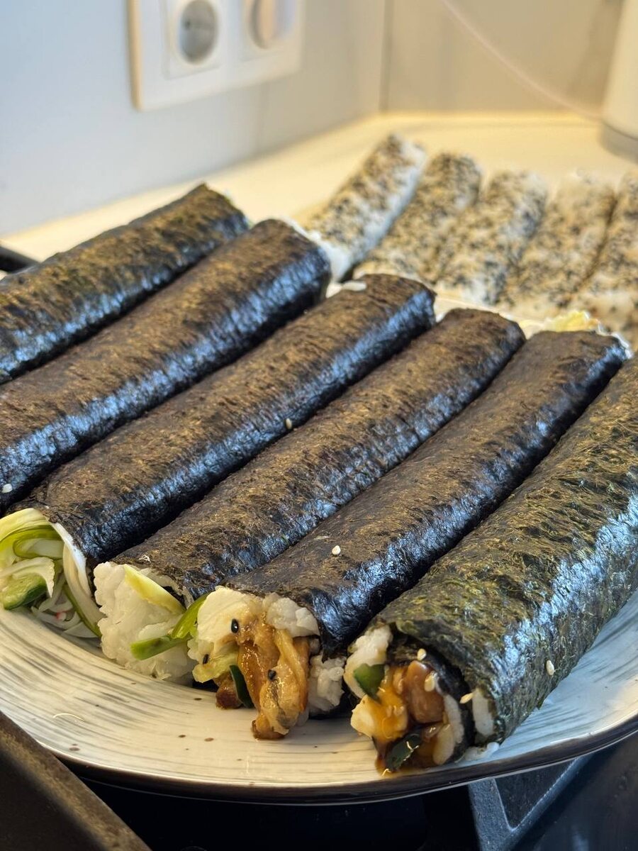 Роллы жареные и холодные, обсыпанные цветным кунжутом. Начинка у меня такая в разной комбинации: Маринованный угорь Крабовое мясо Красная рыба Курица маринованная в терияки Огурцы Авокадо Салат чука Творожный сыр Ореховый соус Самое сложное это сварить правильно рис, его я делаю только в мультиварке, иначе он пригорает в кастрюле. Воды мало -1:1, поэтому томится он может только при медленном подогреве.