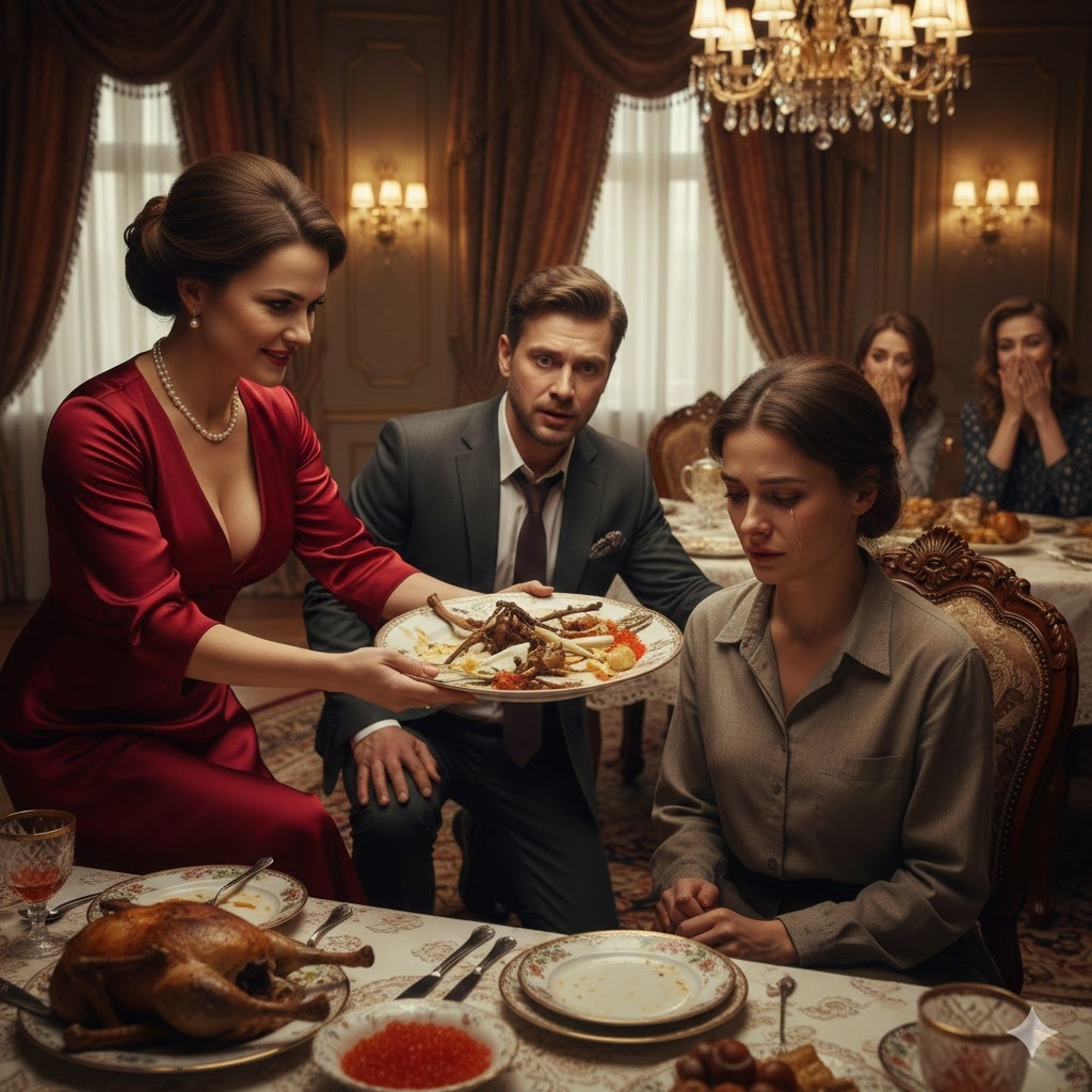 Андрей смотрел на Дашу, и его лицо медленно бледнело. Взгляд его скользнул по её старой одежде, по красным рукам и, наконец, остановился на тарелке с объедками, которую Ирина так любезно ей пододвинула.
