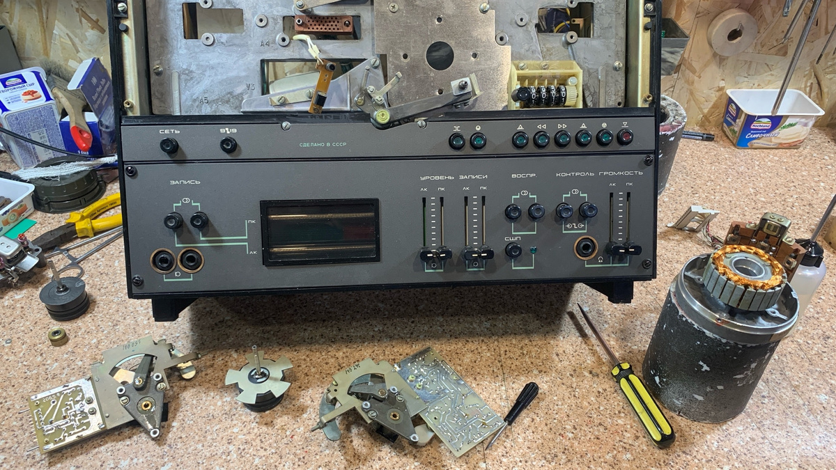 Регулярно проводите ТО своих аппаратов согласно указаний в Инструкции по эксплуатации. В противном случае получите вот это: Смазать подшипники скольжения инерционных роликов не просто, поэтому рядовые пользователи этим не заморачиваются, а напрасно. Лично я регулярно провожу ТО своих магнитофонов, именно поэтому они прекрасно работают уже много-много лет. Разумеется, аппарат необходимо разобрать: снять узлы натяжения и ведущий двигатель. Я заклеиваю отверстия подшипников инерционных роликов: Или затыкаю их ватной палочкой: После чего заливаю масло Т-22. И оставляю на несколько часов. Это необходимо для того, чтобы масло "напитало" бронзографитовые втулки - масло должно проникнуть внутрь. Аналогичная процедура и с ДБ-95. Отверстие плотно забито ватным диском, внутрь залито ВНИИНП 50-1-4-Ф. Масло жалеть не надо, его можно приобрести, в отличии от двигателей и других узлов аппарата.