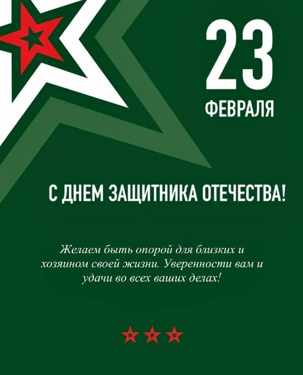 🎉 С Днём защитника Отечества! Желаем быть опорой для близких и хозяином своей жизни. Уверенности вам и удачи во всех ваших делах!